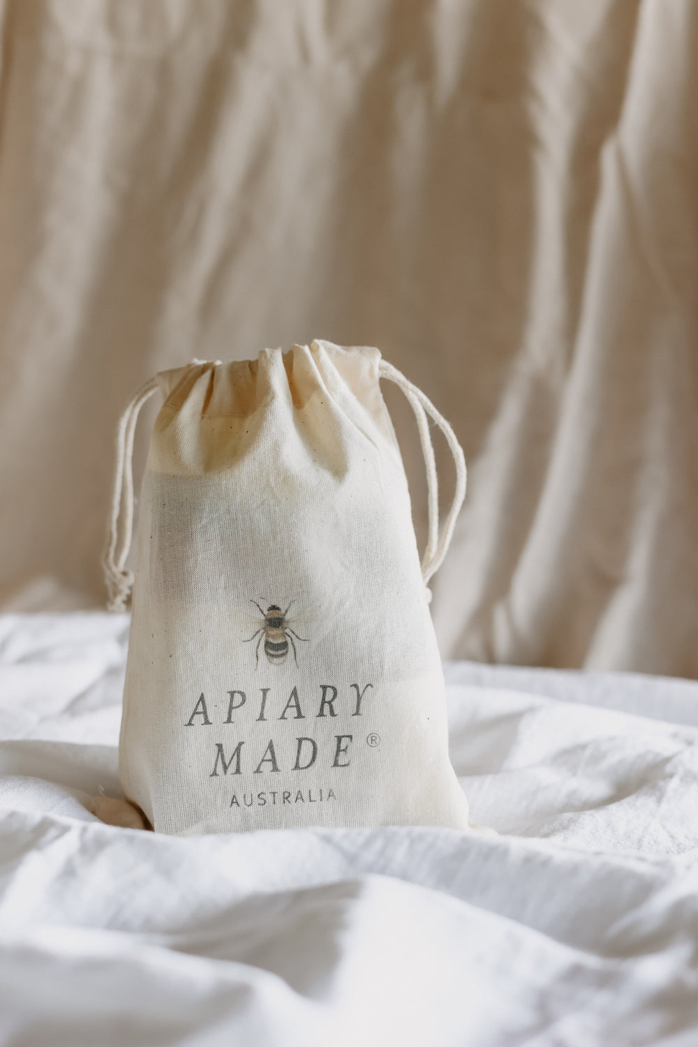 Signature Bar Soap – 120gms of handmade luxury with Apiary Made’s signature scent – of bergamot, patchouli and lemon oil and its hero ingredient the finest of Trawool Valley honey. This artisan bar is topped with resin, leptospermum blossom and leaves – from the Manuka and Jelly Bush family – this symbolises our respect for the bees, their wax and the resin we use to make our premium beeswax wraps.